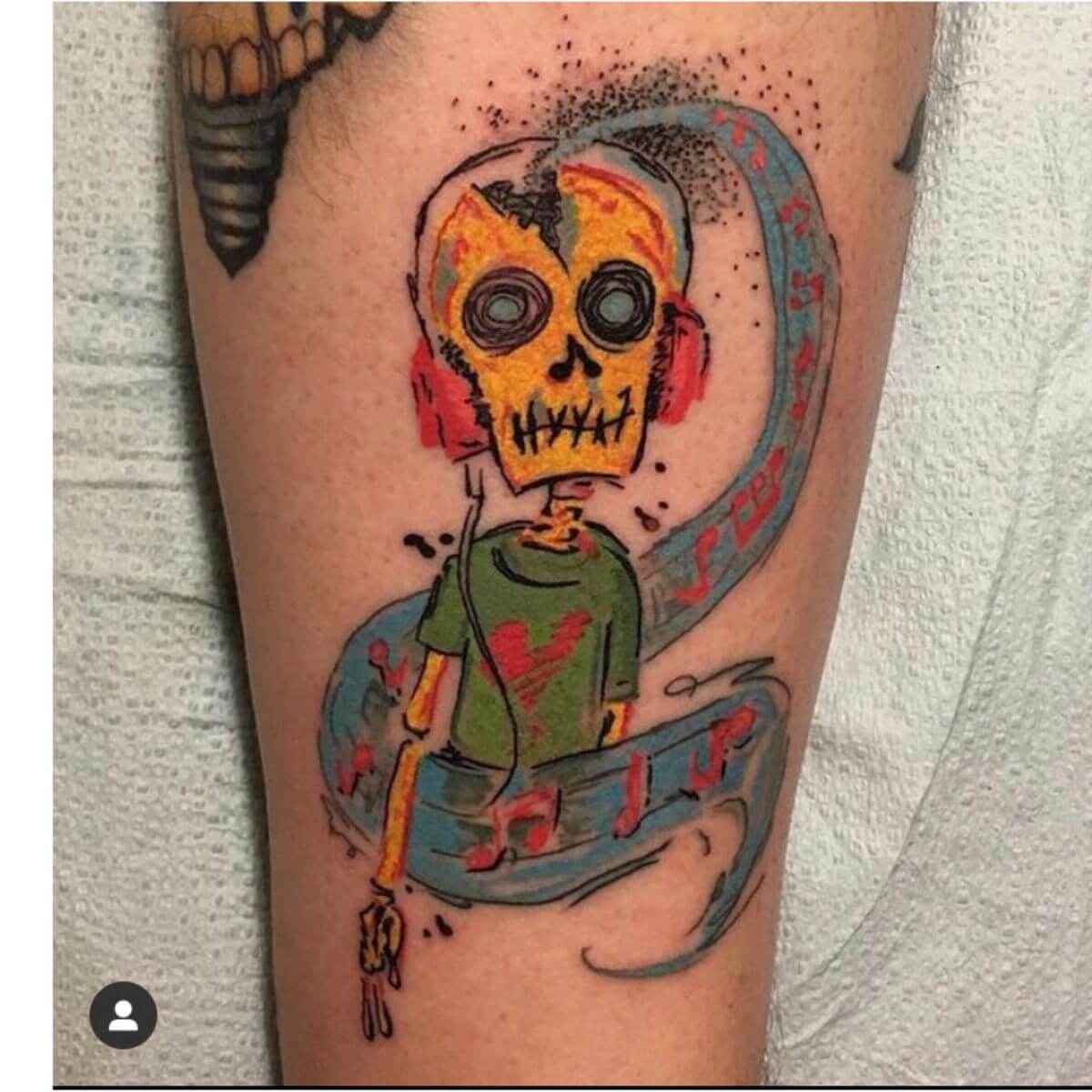 Color Skull Tattoo By Tupicalo For A Local Music DJ. The client asked Tupicalo to tattoo this representation of the music in his head. Call 404-973-7828 or stop by for a free consultation. Walk ins are welcome.