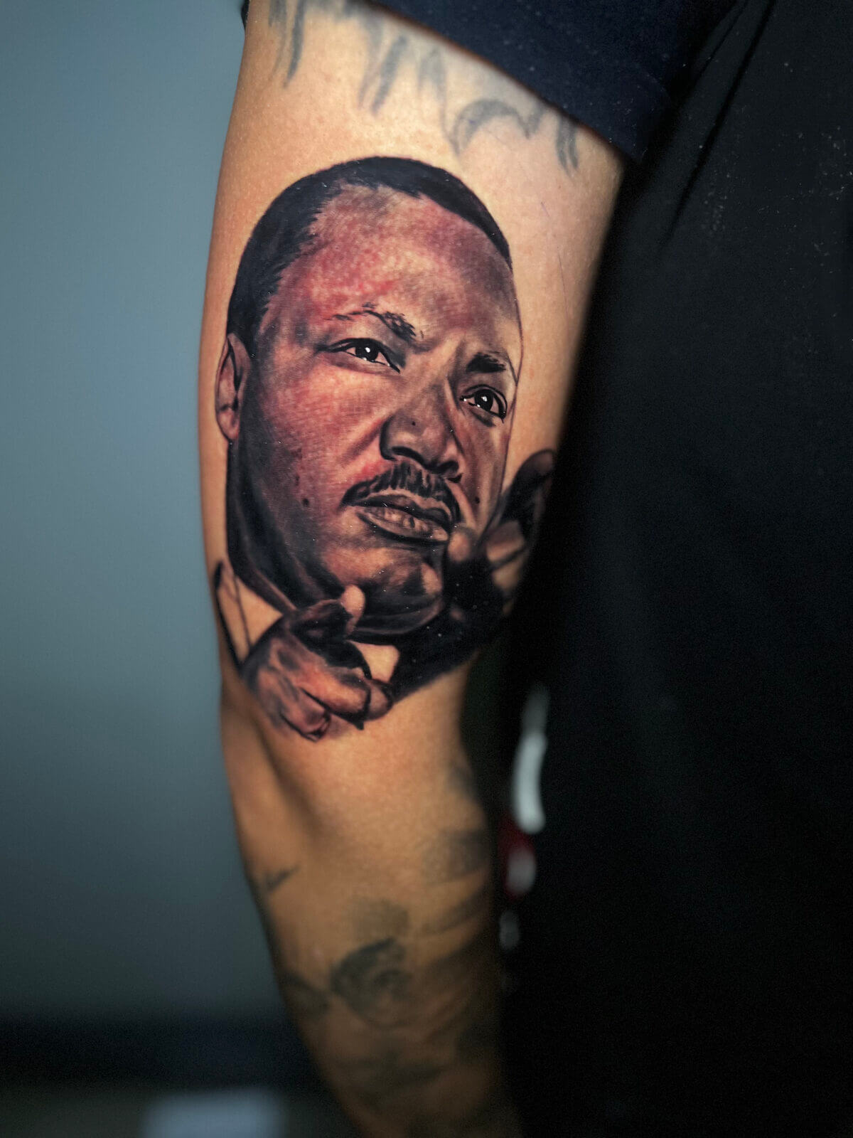 Martin Luther King Portrait Tattoo By Terrance Sawyer. Terrance inked this memorial tattoo of MLK for a client at Iron Palm Tattoos in Atlanta, Georgia. Call or text 404-973-7828 or stop by for a free consultation. Walk-ins are accepted.