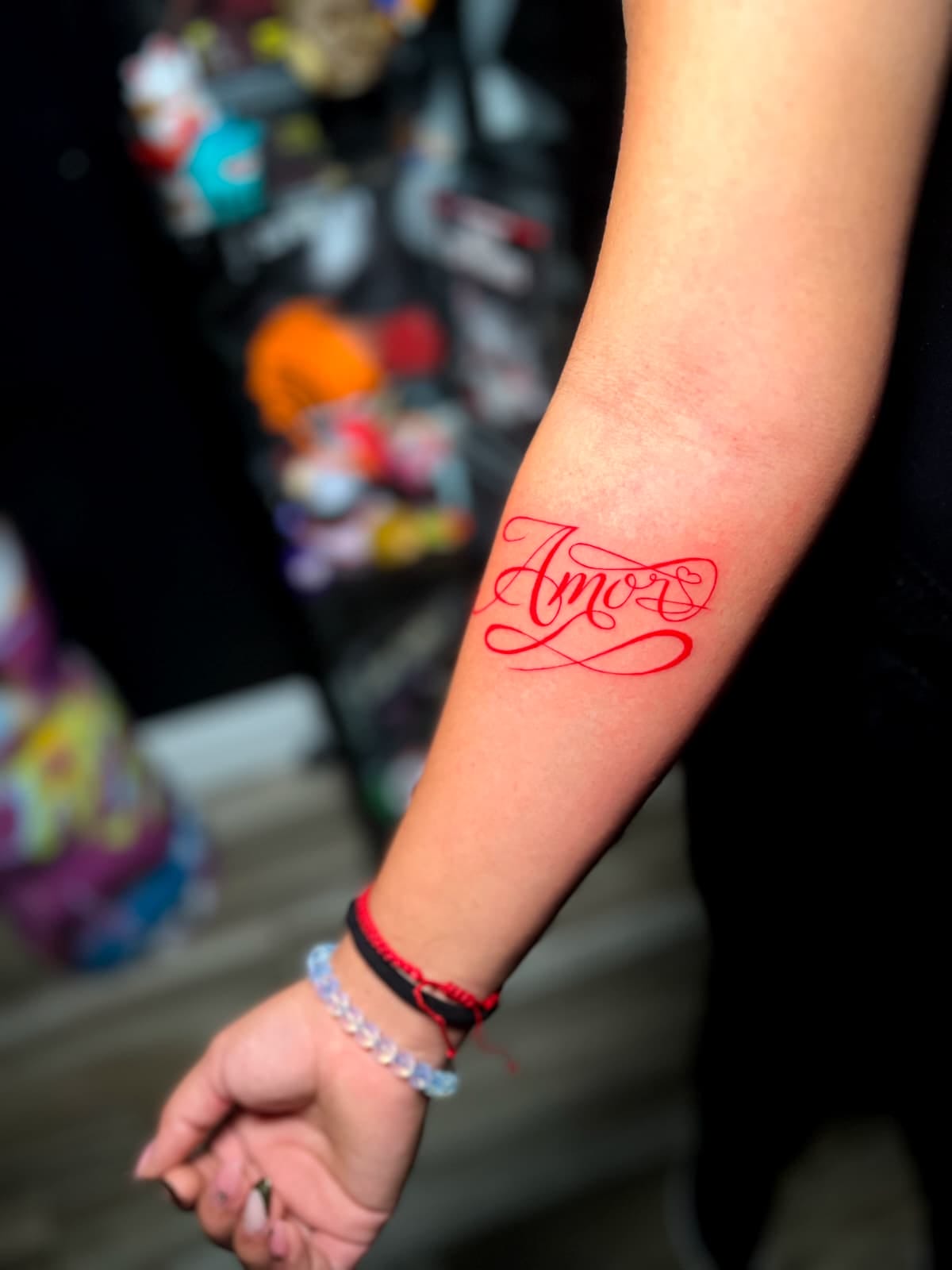 Red Script Lettering “Amor” Tattoo Friday The 13th & St Patrick’s Day Weekend By DB Wyte